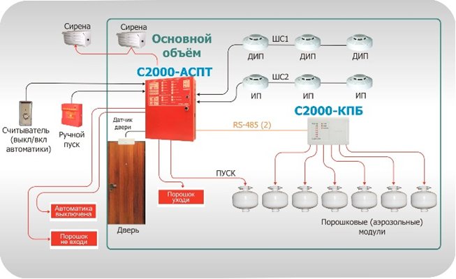 Пример реализации локальной установки порошкового тушения показан на рисунке. В качестве приёмно-контрольного прибора и прибора управления установкой используется прибор «С2000-АСПТ». Для запуска порошковых модулей применён контрольно-пусковой блок «С2000-КПБ», осуществляющий контроль исправности пусковых цепей в дежурном режиме и активацию модуля в случае тушения. Прибор «С2000-КПБ» управляется прибором «С2000-АСПТ» по интерфейсу RS-485.