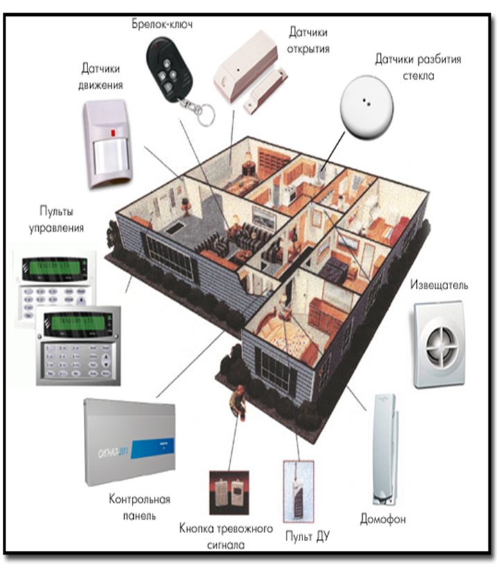 Основные части системы охранной сигнализации – это датчики, управляющая централь и сирена.