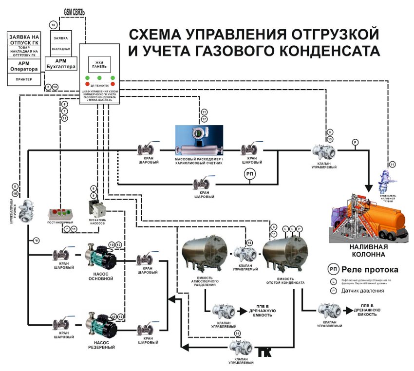 11, 12) По команде отсекателя наливной трубки или по данным счетчика о достаточном объеме отгрузки, по данным Заказного листа или по кнопке «Стоп» на КП-оператора с принудительным остановом, по достаточности ГК в автоцистерне, или по данным уровнемера в ЕК о выборе всего объема конденсата из ЕК. ШУ отключает питание от пускателей насосов, а тот отключает насос.