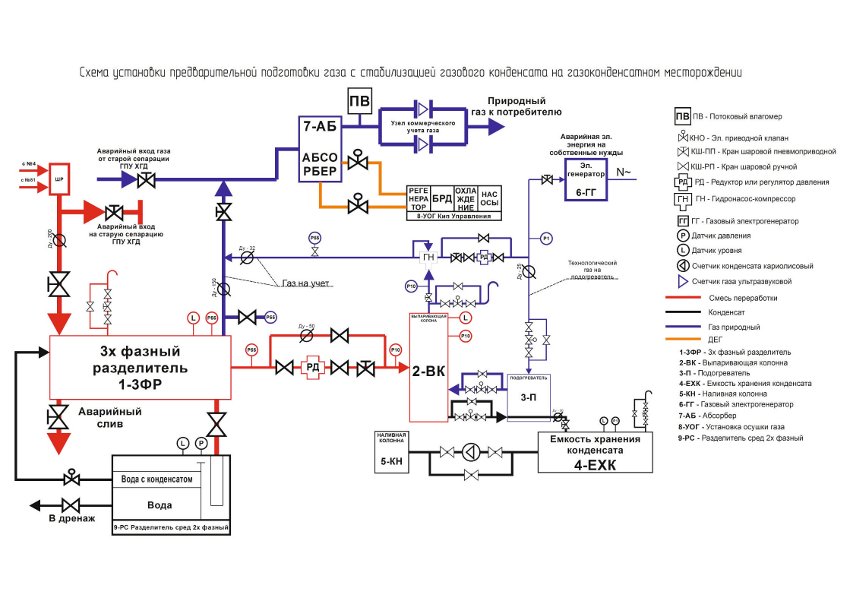 5. Стабилизирующая колонна газового конденсата, в комплекте с подогревателем ДЭГ, выпарной колонной, гидронасосной эжекционной системой отбора выпариваемых паров природного газа (далее подаются в газопровод или как топливный газ на промысел), средствами автоматизации и управления (датчики, индикаторы, сигнализаторы, регулирующие клапана, арматура). После технологического процесса на Колонне стабилизации, по выходу получаем товарный конденсат.